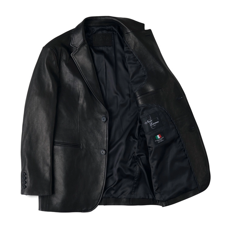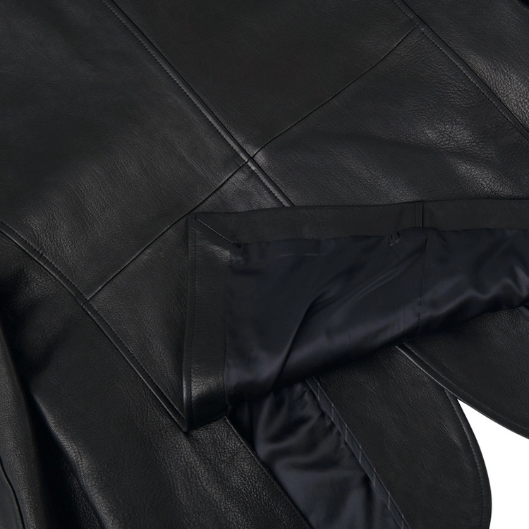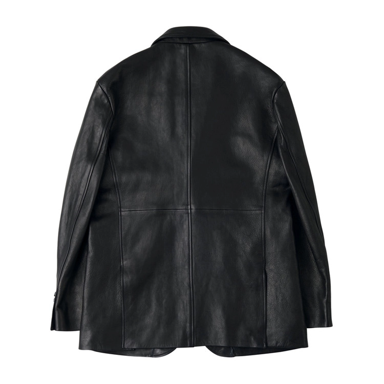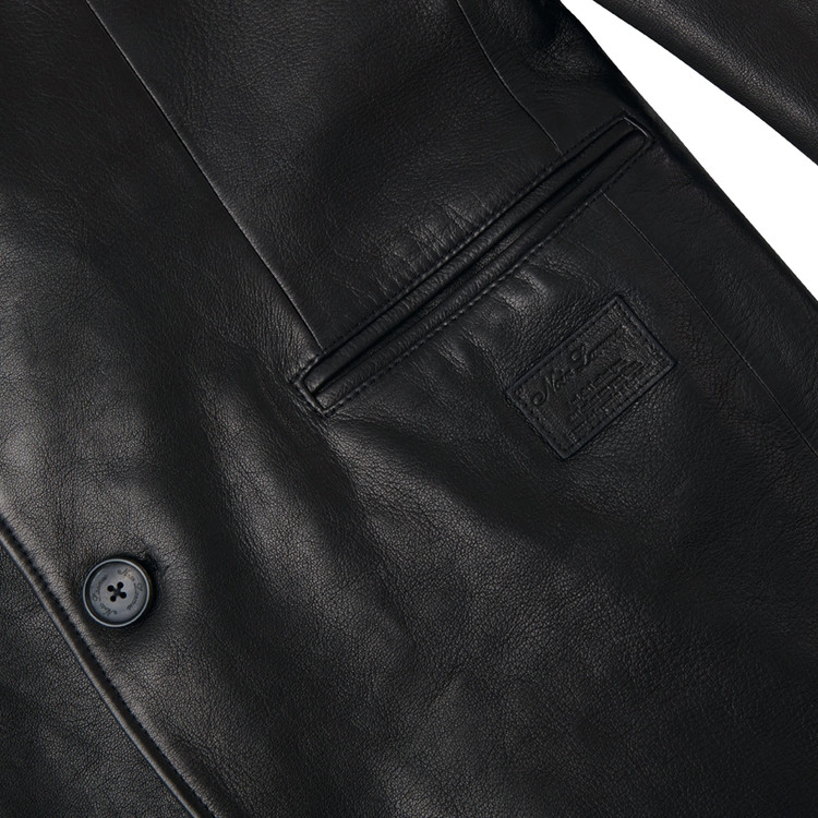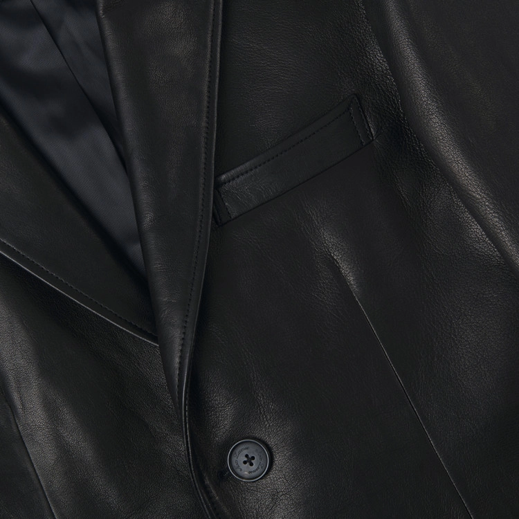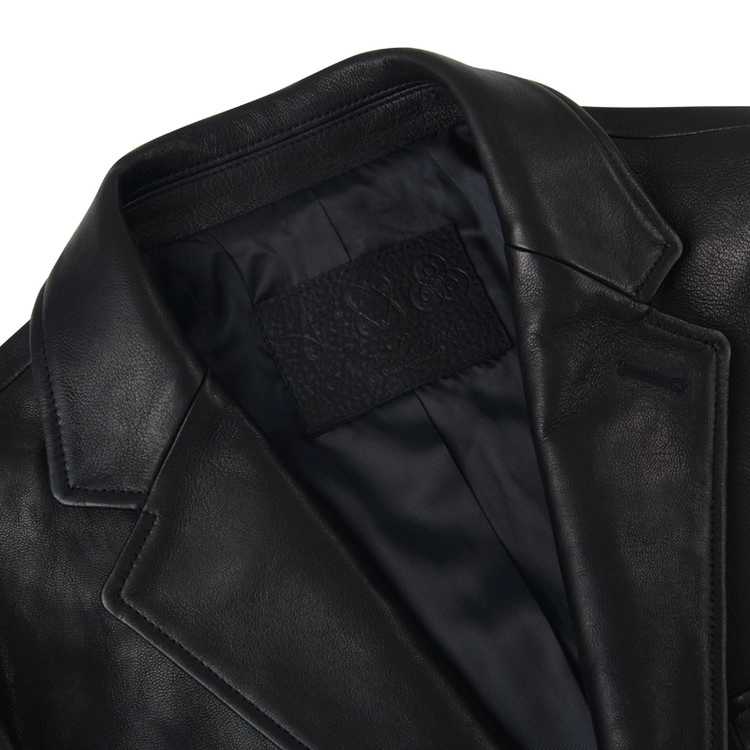 采用两粒扣单排西装版型的皮革夹克,配有缺口驳领、Barchetta 胸袋、翻盖口袋以及双开衩结构。使用原版牛角纽扣,腋下设有防汗衬片,并以马鞍缝线工艺收尾。