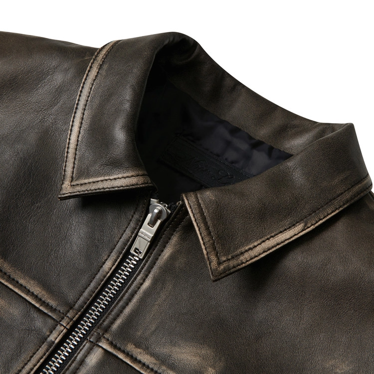 下摆采用后身无松紧结构的分割式裁片设计,即使拉开拉链,底部轮廓依然保持稳定。胸前约克不仅是造型元素,更用于分散皮革在穿着过程中产生的自然收缩与张力,避免集中于单一区域。