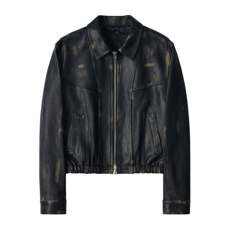 整体以裁片结构为中心构建,各分割位置均结合做旧褪色工艺进行布局。通过将上部横向裁片下移,降低视觉重心,再以纵向裁片整理整体印象。虽然结构上也适合搭配立领设计,但最终采用端正的常规领型,使整体氛围更加克制与精炼。