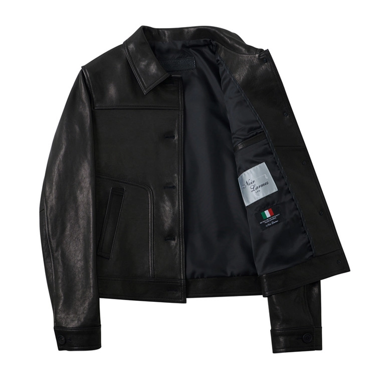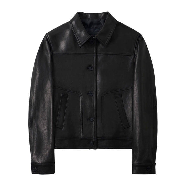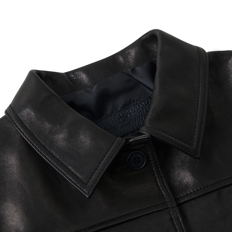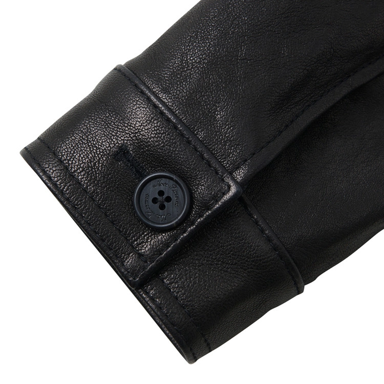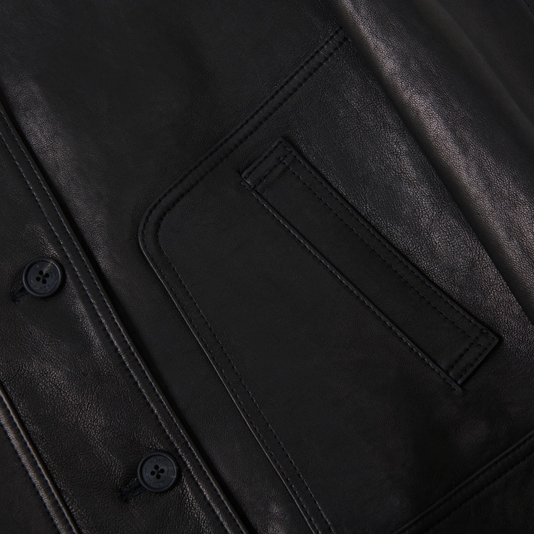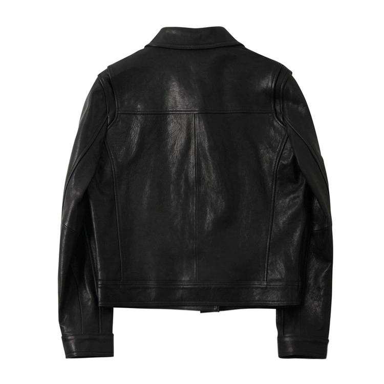 后背加入动作褶设计以提升活动性,袖口则以单扣工作袖口收束。整体气质沉稳,削弱了皮革固有的厚重感,使其能够与多种日常穿搭自然融合,保持灵活而平衡的风格。