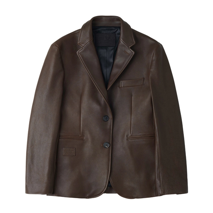 采用两粒扣单排西装版型的皮革夹克,配有缺口驳领、Barchetta 胸袋、翻盖口袋以及双开衩结构。使用原版牛角纽扣,腋下设有防汗衬片,并以马鞍缝线工艺收尾。